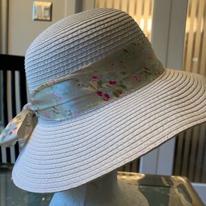 Chic Off White Hat w/Pink, Cream,Green, and brown Ban and bow