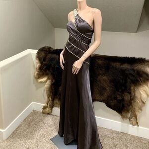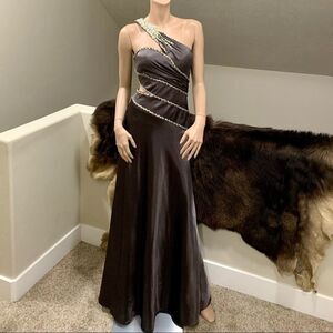 This gorgeous gown features an asymmetrical one-shoulder design with a cutout back. Silky satin, delicate beading and sequins all hand sewn. Flowing and elegant for formal events and evenings.