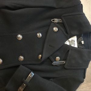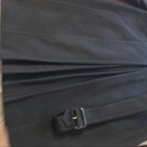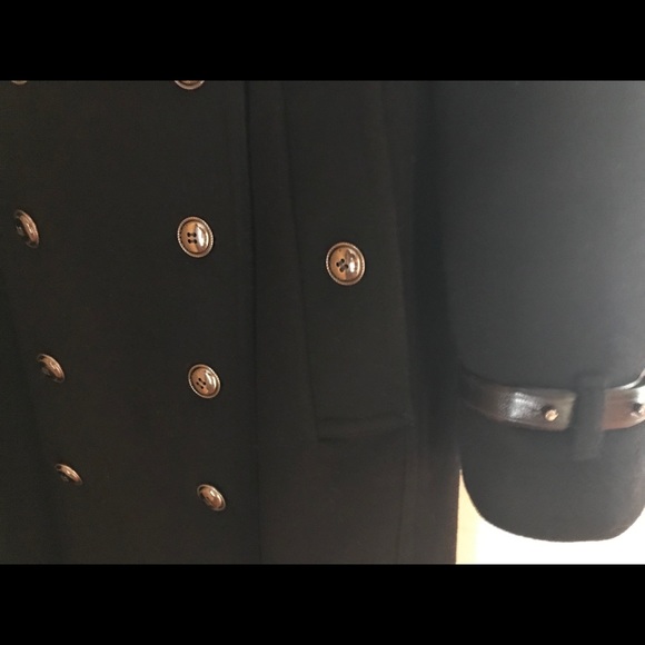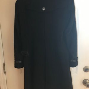 Burberry London wool/cashmere mid- lenght (39 inc) Military Trench version black coat, with leather details, belted. 80% wool , 20 % cashmere , 50% viscose , 50% acetate. Made in Bosnia, Usa size 12. Worn only 4 times, like new !