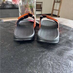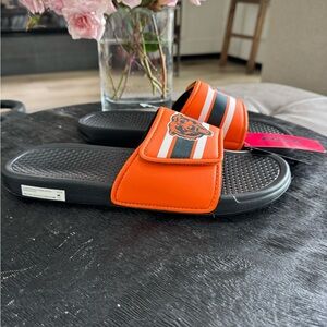 Orange and black Chicago Bears slide sandals with logo.
