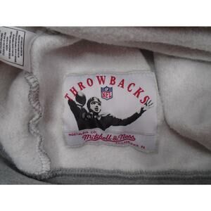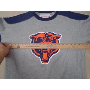 The product is a Chicago Bears sweatshirt for men in size large, featuring a gray color with blue accents. It is officially licensed by the National Football League (NFL) and made by Mitchell & Ness. The sweatshirt is designed in a crew neck style and is perfect for wearing during the regular season games. Whether you're a die-hard Bears fan or just love football, this throwback sweatshirt is a must-have for any fan apparel collection.