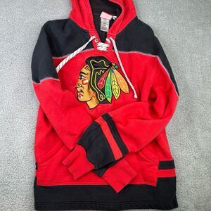This is a preowned, very loved hoodie NHL Reebok face off collection, Chicago Blackhawks size medium shoulders approximately 17 pit to pit 20 length , 25