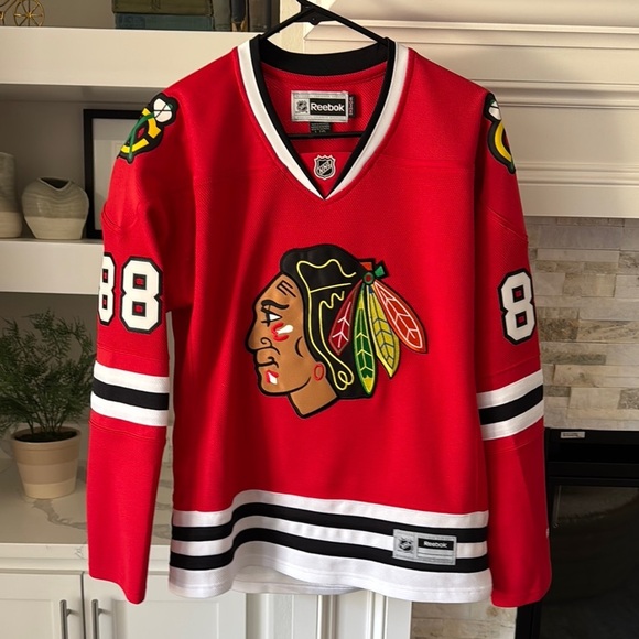 Red Reebok Chicago Blackhawks hockey jersey with bold graphics. Features number 88 and team logo.