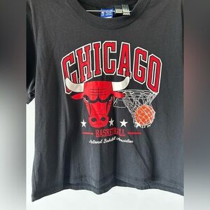 Black graphic t-shirt featuring Chicago Bulls design with red and white accents.