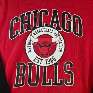 Show off your team pride in this Chicago Bulls NBA sweatshirt. Officially licensed by NBA Properties (2022), this pullover features bold Chicago Bulls graphics across the chest. Made with a comfortable cotton-polyester blend, it offers both warmth and breathability. Classic crewneck style in red with contrasting black sleeves.