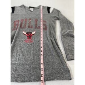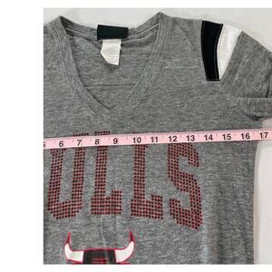 Chicago Bulls shirt, women’s sports shirt, rhinestone logo shirt, v-neck long sleeve, NBA apparel, fan gear, team spirit top, 5th & Ocean, grey Bulls shirt, sporty casual wear, game day outfit