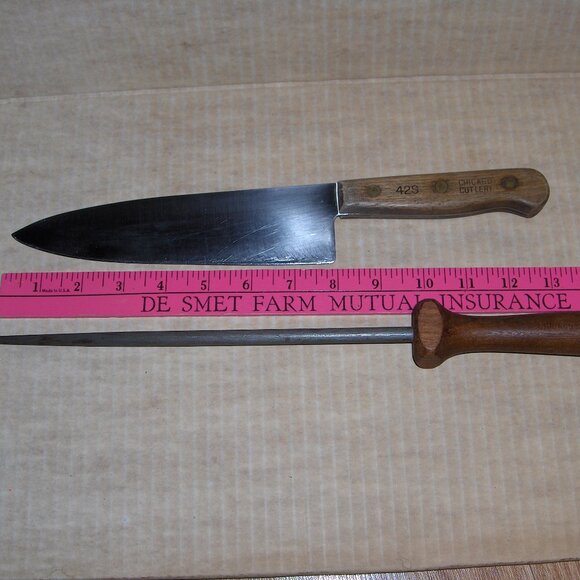 Chicago Cutlery Chef Knife 42S and Sharpening Steel. The knife was a little dull, a few swipes on the steel and it has a pretty Nice edge. Vintage. Steel has USA Knife not marked, But Age would be USA Quality Products. Have Great Day! U-28