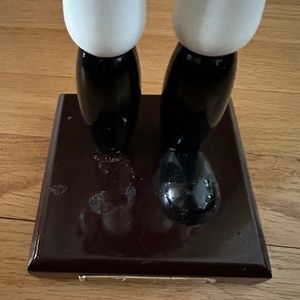 Chicago White Sox 2002 Rare First in Limited Series Nutcracker. From Memory Company. 14 1/2" tall, including base. Beautifully painted Nutcracker soldier dressed to resemble the Chicago White Sox uniform. Paint is in perfect condition with the exception of wear on the edge of the back handle (see last picture.) Back handle opens and closes the Nutcracker's mouth. Brass tone plaque attached to the front of the base reads Nutcracker Chicago Whitesox. It has a clear film that is beginning to peel on the top edge. Soft black tufts of fur, which resembles rabbit fur, under mouth and back of head. Holes have been drilled into the base and pegs attached to the end of the Nutcracker's legs fit him into the base. As a result, there is movement to the Nutcracker-glue could be added for stabilization. Nutcracker is missing his right foot (see pic 15). Base is 4 1/4" X 4 1/4". In my research, I could not find another one online.