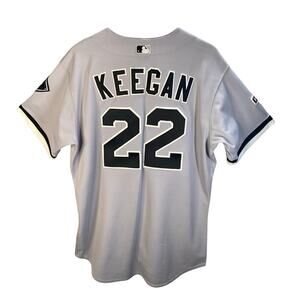 Authentic MLB Majestic baseball jersey, featuring the Chicago White Sox team name in a stylized font across the chest and Keegan's name and number 22 on the back. This gray jersey also showcases the MLB logo on the back neck and a team logo patch on one sleeve, along with an All-Star game patch on the other sleeve. Perfect for showing team spirit at a baseball game, a casual outing, or while watching the game at home.