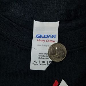Black shirt with colors of red, white, blue, gold & silver