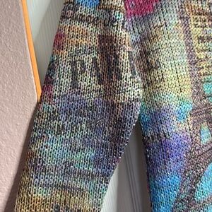 Vibrant knit sweater with a graphic design. Features a mix of colors including blue, pink, and brown.