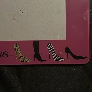 A fun SHOE 👠 frame!!! I used this as a helpful way to book parties @ my jewelry home parties! 🎈 Frame is made of glass. Slight wear of black velvet on back. The 1st “sparkle” has lost some of its side as shown in the last photo.