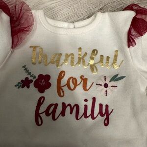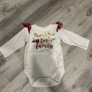 Charming cream bodysuit with 'Thankful for Family' design. Features red accents and gold lettering.