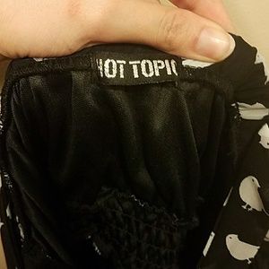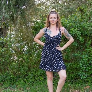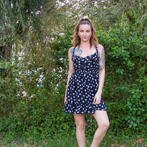 Cute black dress with chick print. Ruffle on bottom hem and top, has keyhole tie front and crossed straps in back.