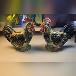 Set of two colorful chicken ceramic holder/planter/container for kitchen items, trinkets, or small plants. Chickens are 5" inches long, 4 1/2" inches tall, and are in excellent condition.