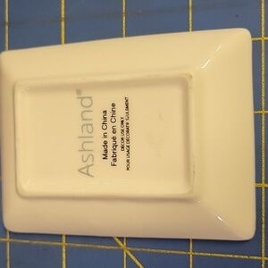 Rectangular dish with a chicken design. Features a green background and cream border. Bin 64