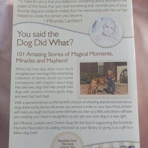 Best selling feel good series Chicken Soup , The Dog Did What? has 101 Inspiring Dog stories for the Dog Lovers!! Also Foreword by Country Music Star Miranda Lambert about her furry friend and proceeds to the Humane Society to benefit furry friends!! Good Condition, no stain or taps (dog ears) on this copy!! Perfect for all Dog Lovers
