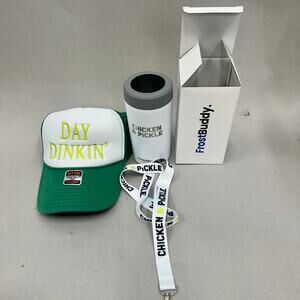 Chicken n Pickle pickleball swag set Day Dinker trucker hat, lanyard, can cooler