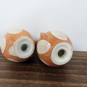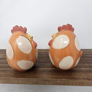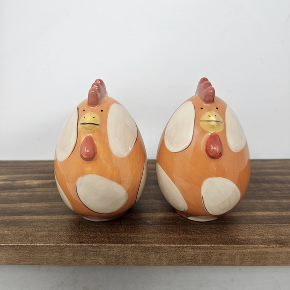 Set of chicken-themed salt and pepper shakers. The set includes a pepper shaker and a salt shaker designed in the shape of chickens. These shakers are intended for use in the kitchen or as collectibles. They are the size of a duck egg, in eggcelent condition!