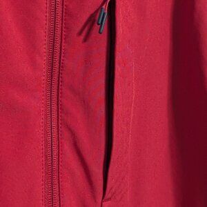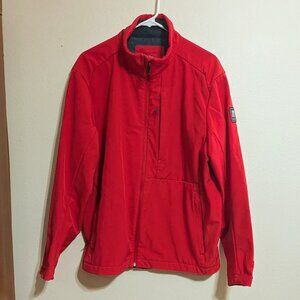 This is a beautiful red Chick-Fil-A OOBE Full Zip Employee Jacket; size L. Features 2 zippered side pockets and 1 zippered pocket at the chest. Sleeves have straps to adjust to tighten sleeves.