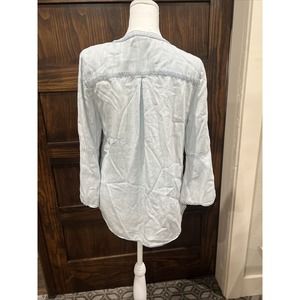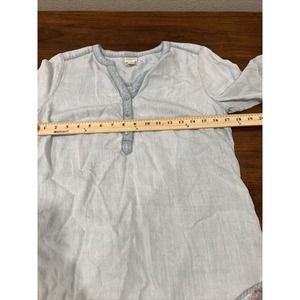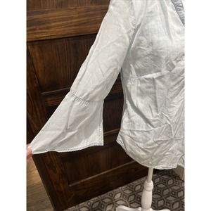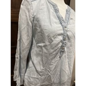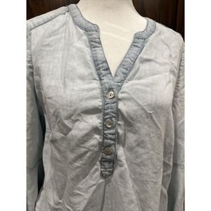 Chico Top Women 0 Small Denim Blouse Tunic 3/4 Bell Sleeve V Neck Button