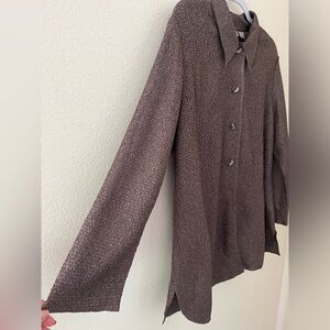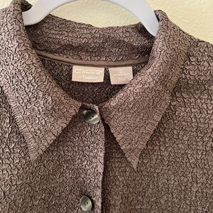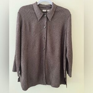 Chico’s Travelers brown stretch long sleeve Shacket buttons half way open towards the bottom.