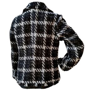 Chico Tweed jacket with Fringe around pockets, sleeves, collar and hem Jacket is black, brown, and white with black metalic string running through material. There are 4 buttons down the front which can be closed or left open. Faux leather around edges of jacket and on the bottom of the sleeves. Fully lined. Jacket material is 93% polyester, 5% cotton, 2% acrylic and 1% rayon. Lining 100% polyester. Length 24", sleeve 23 1/2", shoulder to shoulder 16", chest 20" flat across. In good condition!
