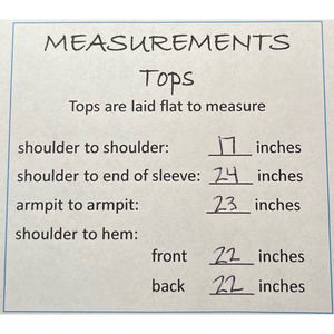 Clothing actual size can be different than the tag size because of washing or style/cut. Please see the measurements in the photos and compare to an item that fits you. All items are laid flat for measurements.