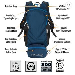 COMPACT DESIGN: It's easy to stuff this full size backpack into the front pocket measuring 8'' x 6'' Opens to a top loading, hydration ready backpack that is comfortable, lightweight, and weighs just 8 ounces Holds 15L
