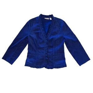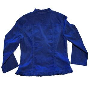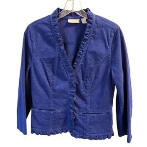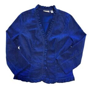 Details: This Chicos Royal Blue Textured Jacket is a must-have for any stylish woman! It not only looks great but is extremely comfortable, with a V-neck, button front, and beautiful ruffles in the front. With its breathable yet warm fabric, this jacket is perfect for all kinds of seasons! Show off your style and spice up any outfit with this high-quality jacket from Chicos.