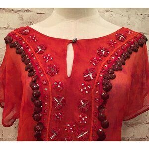 Lovely Chico's 0 (Small) Short Sleeve Sheer Silk Crinkle Chiffon Top Embellished Cinch Tie Waist Orange.