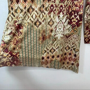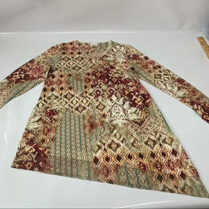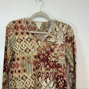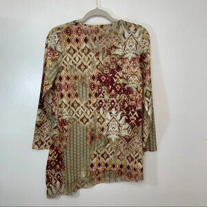 Chicos 0 Top Shirt Woman Small Asymmetrical Long Sleeve Maroon Tan Print