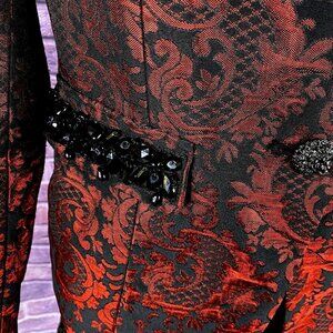 Elevate your wardrobe with this exquisite Chico's jacket, featuring a luxurious paisley damask pattern in red and black. The beaded pockets add a touch of elegance, making this jacket an ideal choice for special occasions or a sophisticated evening out. Its tailored fit and unique design will enhance your style effortlessly.
