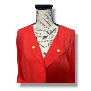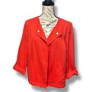 Chico’s 1 (M) Coral Red 100% Linen Jacket Roll Tab Sleeve Open Front Resort Chic