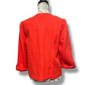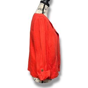 Description: Effortlessly stylish, this Chicos orange linen jacket features an open front, roll-tab sleeves, and functional pockets. Lightweight and breathable, it's perfect for layering in any season.