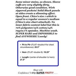 Some minor stains, as shown. Sleeve cuffs are very slightly dirty. Otherwise good condition. Wirh zippered pockets! Solid Black panels at sides create a slimming effect. Open front. Chico's size 1 which is equal to a regular women's medium/8 (Chico's size chart attached). No inner fabric content label but this is 70% polyester/15% cotton/14% rayon/1% spandex. Machine wash. SUPER RARE and IMPOSSIBLE to find ANYWHERE! Lovely!