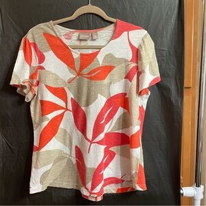 Chico's short sleeve tee with bold orange and tan leaf design. Lightweight and stylish. Great preowned condition. Approximate measurements below: