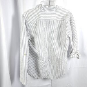 Chico's 1 Womens 8 White Gray Striped Roll-Tab Sleeve Button Down Shirt Blouse