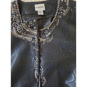 Chicos 1 Women’s Evening Jacket Open Black Velvet Flocked Rhinestone Beaded L/XL