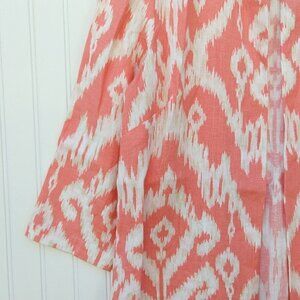 Chico's Ikat Print linen long sleeve jacket in Sunrise Orange, size 1 (US 8/10). New with tags, no noted flaws. Measurements are approximate, lying flat. 21" Bust pit to pit
