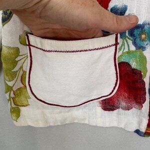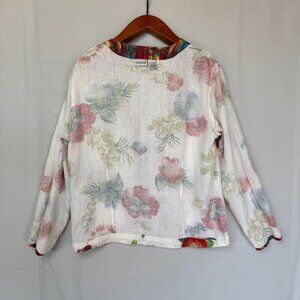This Vintage Topper Jacket Top from Chico's was Made in Turkey and constructed in 100% Linen ivory, red, blue, yellow and green water color floral print fabric. It features a v neckline, tie front bodice closure, long sleeves, right cresent pocket w/ velcro closure and a relaxed low hip length silhouette. This is boho, lagenlook, artsy, cottagecore, office, coastal grandma, beachy, layering, lightweight, euro summer, classic, timeless vibes.