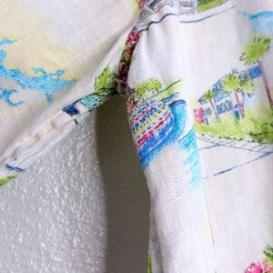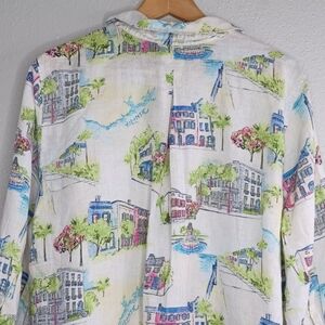 Chico's 100% Linen Novelty City Print Long Sleeve Button Down Front Blouse.