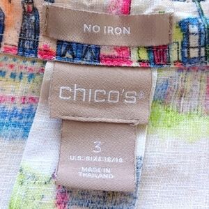 Chico's 100% Linen Novelty City Print Sz 3 Long Sleeve Button Down Front Blouse