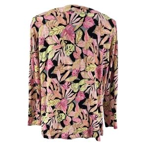 Large Petite. Good used condition, with no stains or tears. A vibrant pink and yellow tropical leaf top, with a split neck. Comfortable and breathable as it is pure linen.