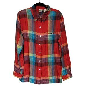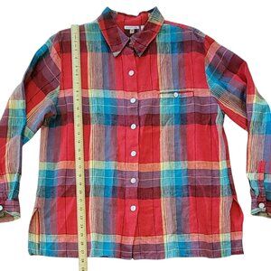 Chico's 100% Linen Red Plaid Long Over-sized Relaxed Fit Button Front Long Sleeve Shirt