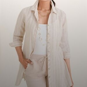 Chicos 100% Linen Tan White Striped FreshChic Non Iron Button Up Size 2 12/14