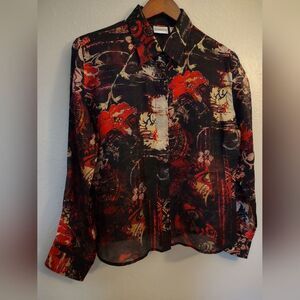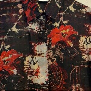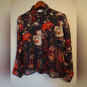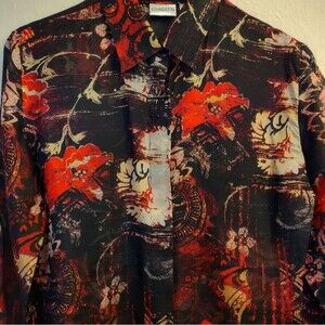 Elevate your wardrobe with this stunning Chico's blouse, crafted from 100% luxurious silk. The blouse features a captivating abstract floral print in rich shades of black, red, and cream, creating a sophisticated and eye-catching design. Its lightweight and sheer fabric makes it perfect for layering or wearing on its own for a touch of elegance. This covered button-down style offers versatility, allowing you to dress it up for special occasions or wear it casually for a chic look.