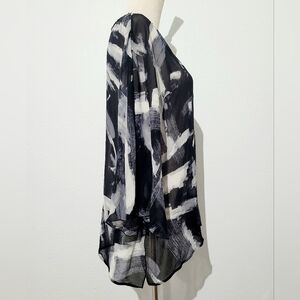 Elegant Chico’s silk tunic top featuring a black and white abstract brushstroke print and a striking beaded neckline. Made from lightweight, semi-sheer 100% silk (exclusive of decoration), this top offers a flowy, relaxed fit with a high-low hem and 3/4 length kimono sleeves. Perfect for pairing with dress pants, leggings, or jeans for a chic and artistic look.