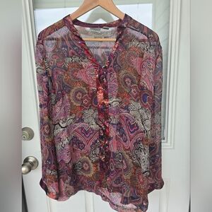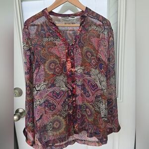 Chicos 100% Silk Paisley Blouse Sz (S-M) Sheer Button Up Long Flare Sleeve Y2k