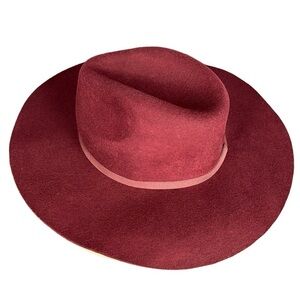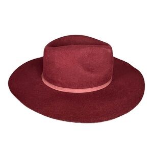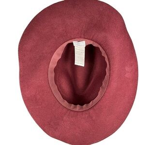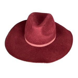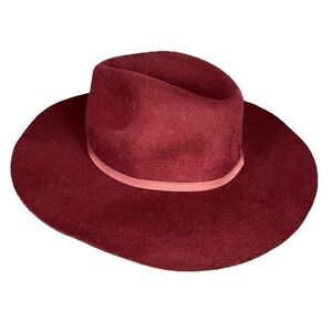 Elevate your accessory game with this bold and beautiful wide brim fedora by Chico’s. Crafted from 100% wool, this hat features a rich burgundy hue and a contrasting blush pink grosgrain ribbon band. The structured crown and wide flat brim make this a standout piece perfect for seasonal style, from autumn strolls to winter brunch dates.